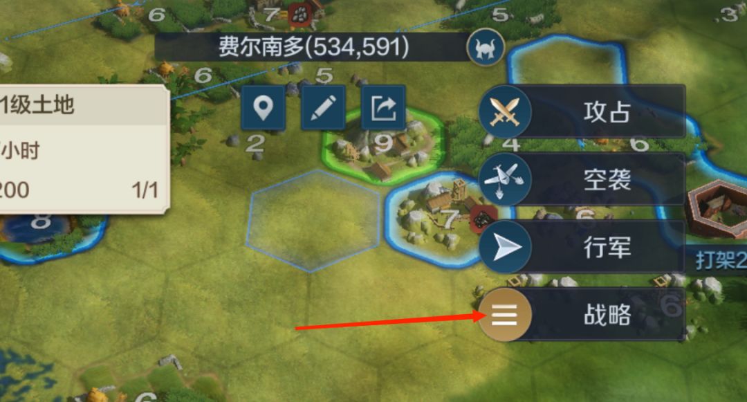 然后在大地图中找到想要空投的位置,不过要注意的是需要在50格范围以内,点击一个目标地块,然后点击战略,这个地块需要有视野,可以在领地附近,或者是有部队在旁边。