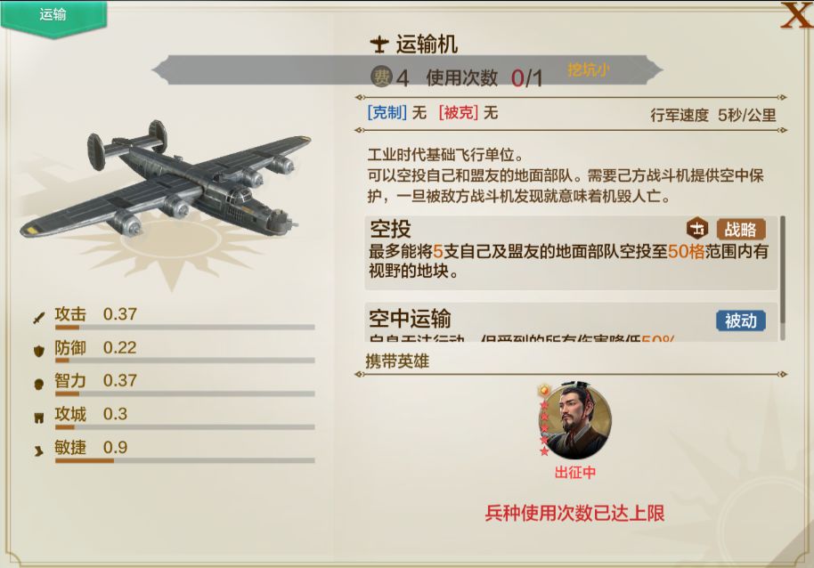 运输机使用范围:只能在自己的城市,机场(工业时代后要塞会自动变成机场)出发,不可以调动到联盟城市,联盟要塞等。