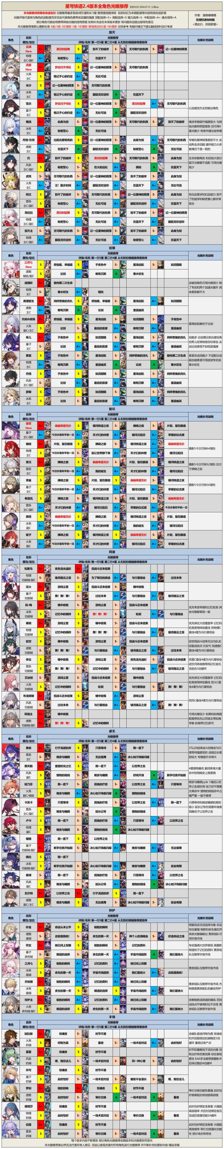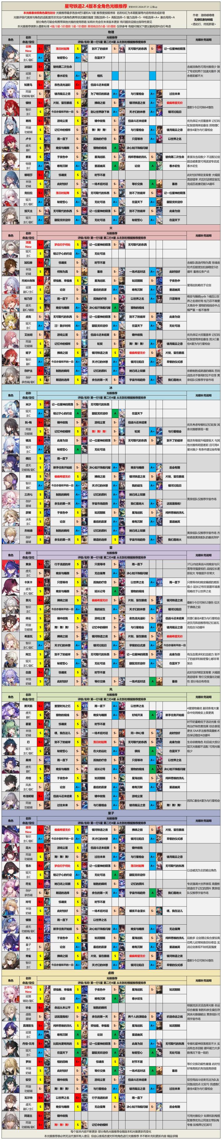 本期属于隔了一个版本恢复的更新,所以就不专门列本期的修改内容了,咱们直接上正篇!奉上以【命途】和【属性】分别归类的两版全角色光锥遗器一图流,量大管饱,欢迎品尝~