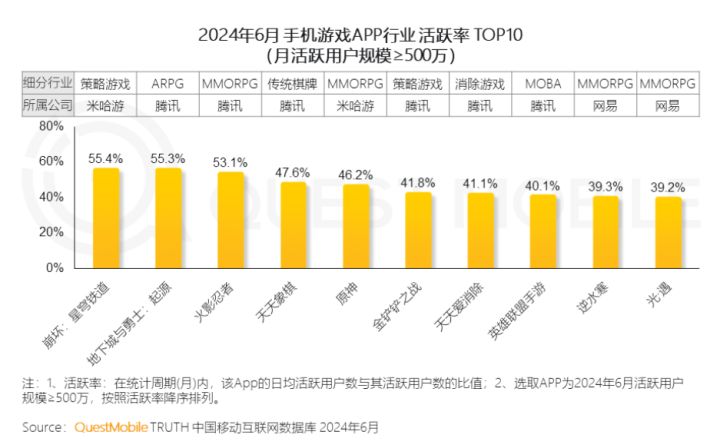 最近,QuestMobile发布了《2024年中国移动互联网半年报告》,其中公布了月活跃规模大于500万人的游戏活跃率TOP10。