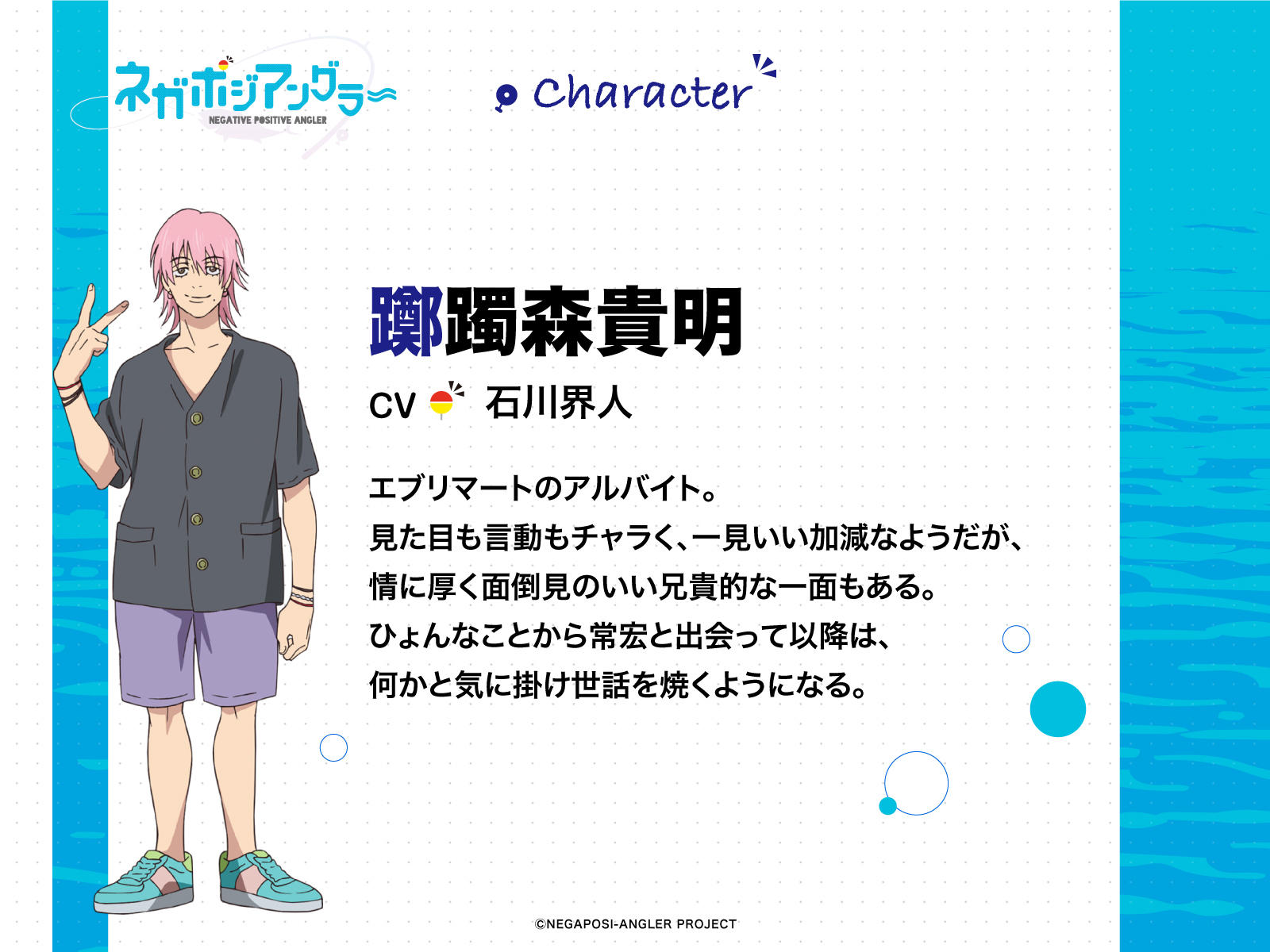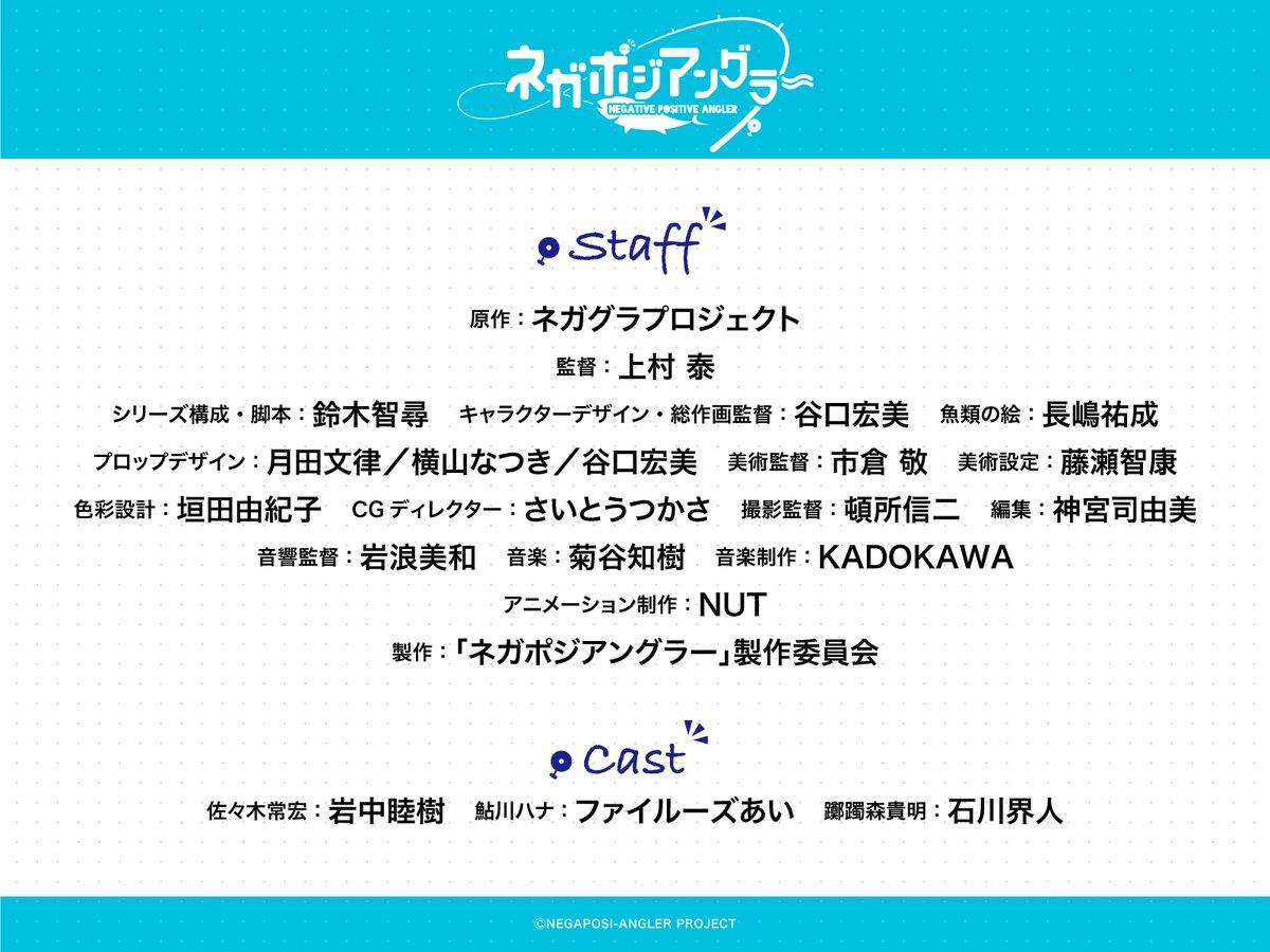 据了解《Negative Positive Angler》将由上村泰执导,铃木智寻负责系列构成和脚本,角色设计及总作画监督为谷口宏美,长嶋佑成则负责鱼类相关绘画。声优方面佐佐木常宏由岩中睦树饰演,菲鲁兹·蓝饰演鲇川花,踯躅森贵明则由石川界人饰演。