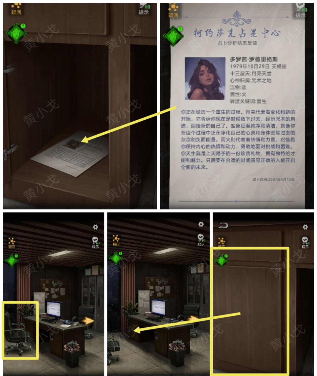 12.点击办公桌右侧柜子上的符号锁,根据占卜结果上的线索(天蝎座、月亮、咒术、盐、火、重生),结合定制密码柜常见符号参考上的线索,按顺序按下对应的符号