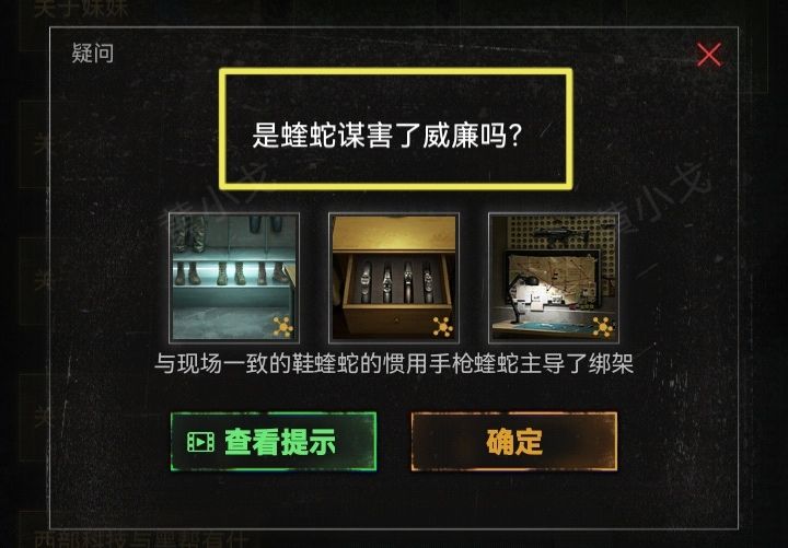 6.剧情后解锁疑问(蝰蛇是否参与了绑架?、是蝰蛇谋害了威廉吗?、蝰蛇家中是否有关于妹妹的线索?)