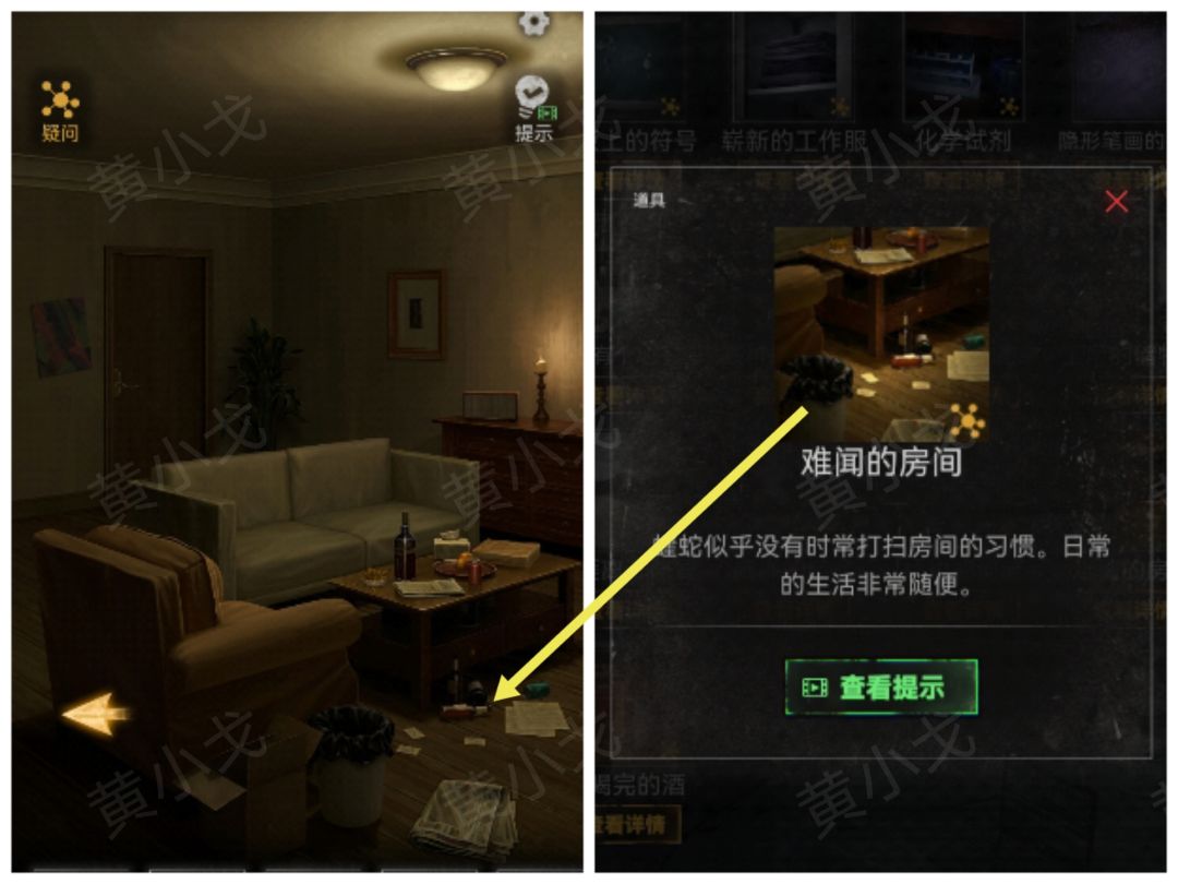 7.(蝰蛇家客厅)点击地上的杂物,解锁线索(难闻的房间)