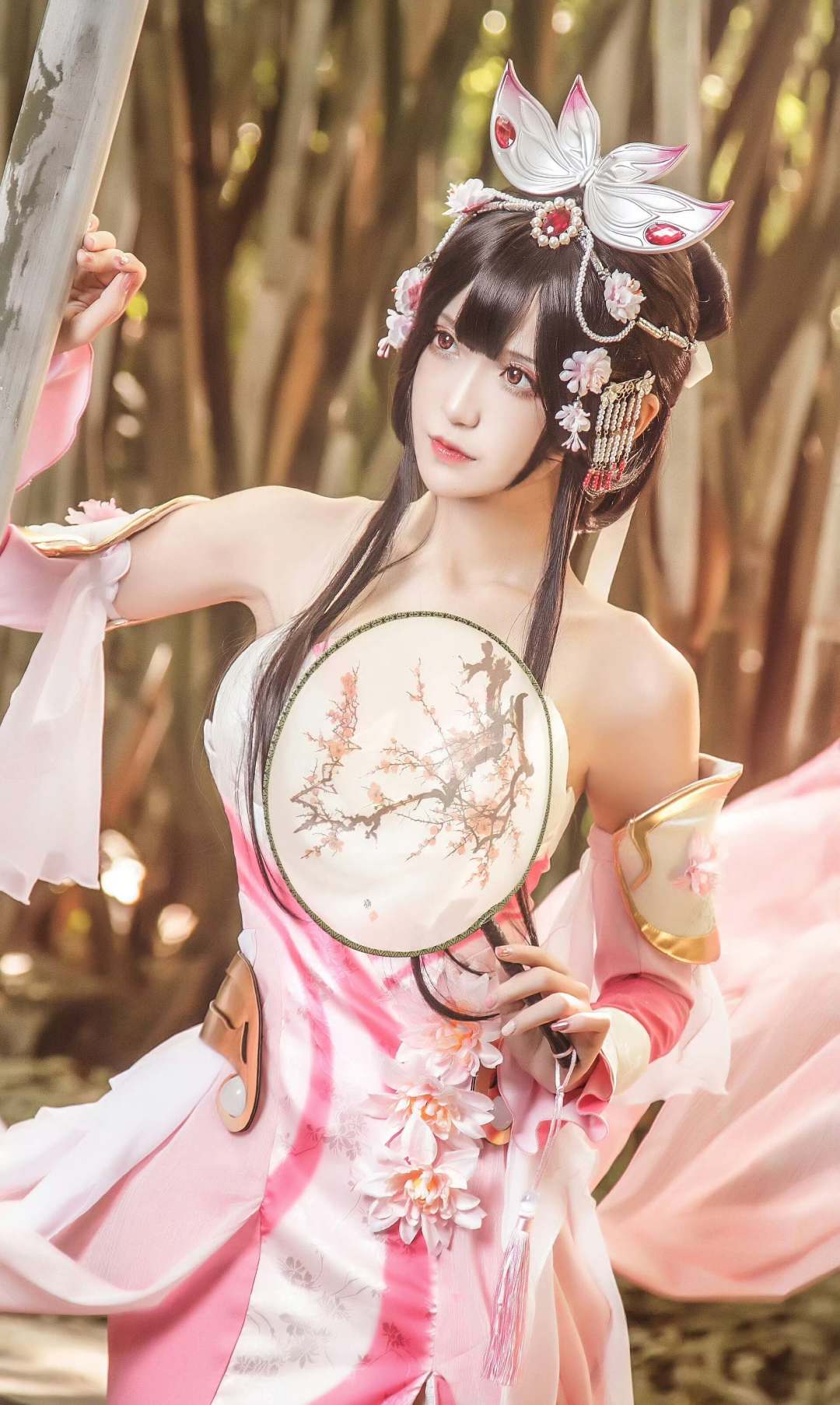 腐团儿COS甄姬,身穿紧身旗袍,手拿粉红团扇,古风造型完美还原