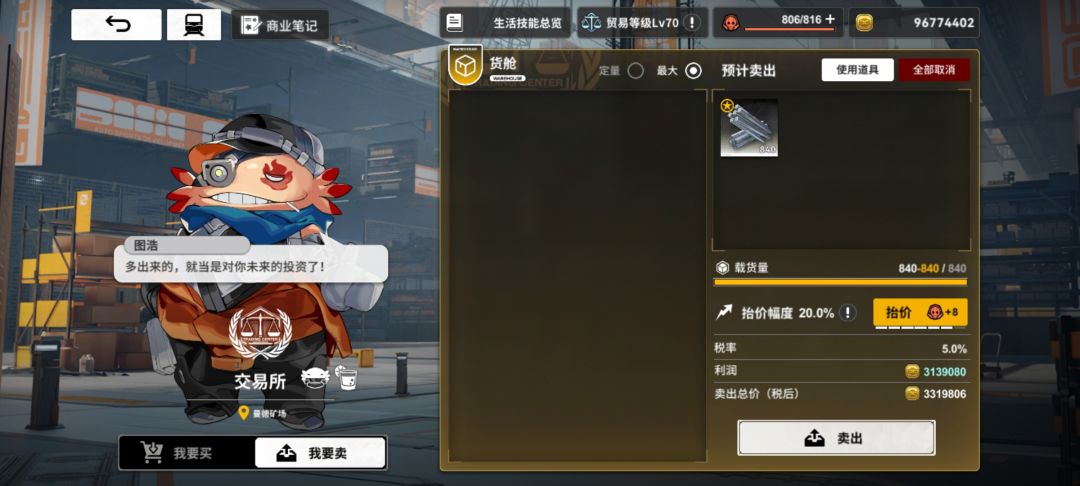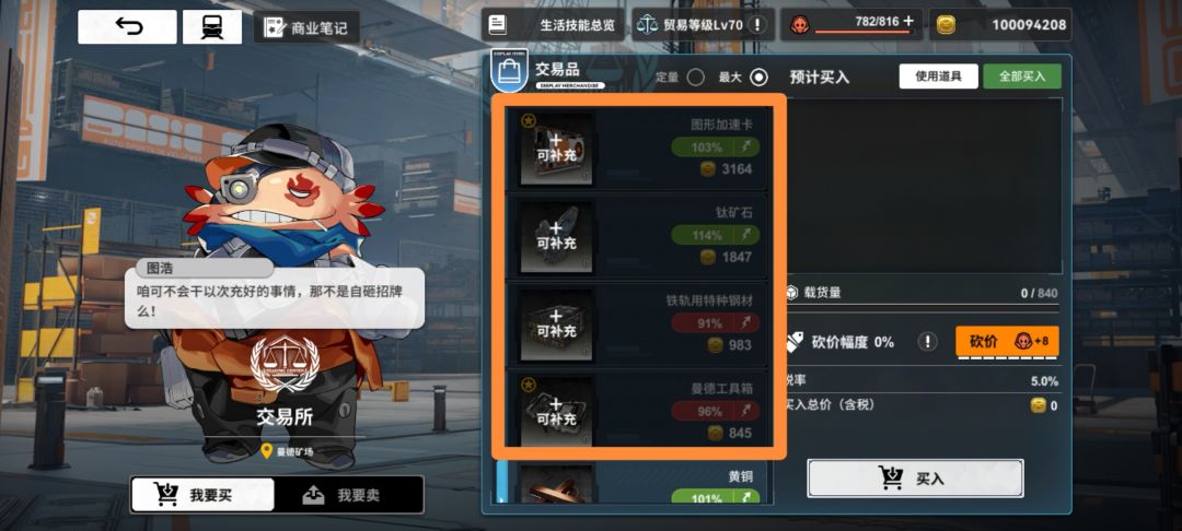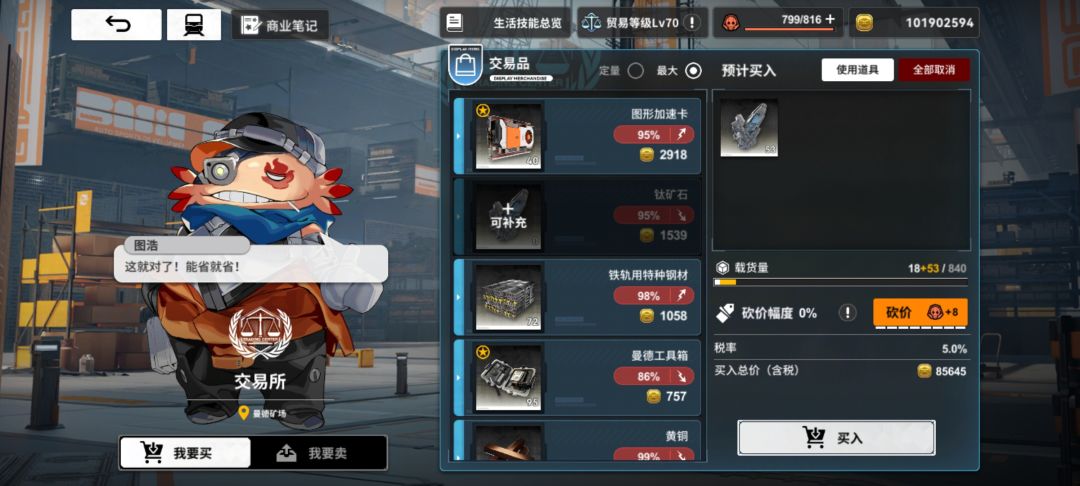 2.每次倒车刷取货物时,前4个全买了,不砍价,买完除了钛矿石其他全丢仓库,等其他3个全满后就倒能源那去,回程时不用书0砍1抬卖出