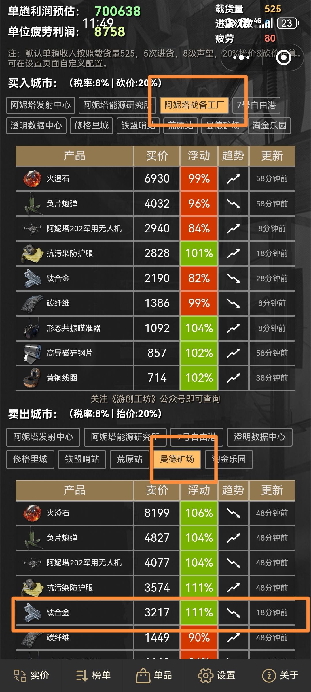 120%时卖出,行情是一小时变动一次,一次变动幅度不超过10%,调个闹钟看最舒服,如图所示,下一次钛矿石的价格是下滑↓,过3个小时后再来看,如果是上升↑的话就过1个小时再来看