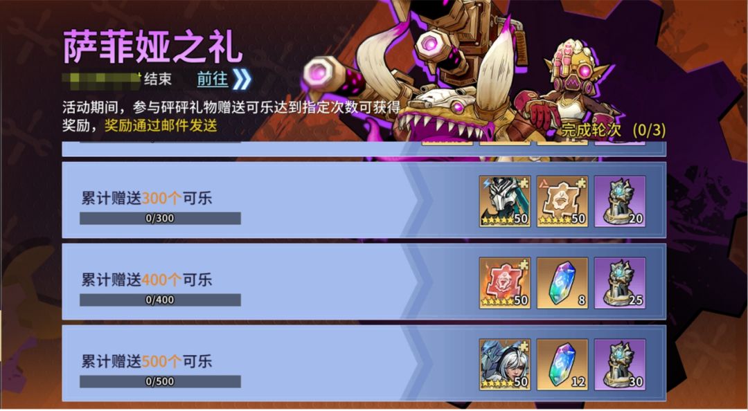 ①每天给萨菲娅赠送可乐获得大量的钻石和砰砰之证,并提升萨菲娅愉悦度,愉悦度达到指定值可额外获得奖励。
