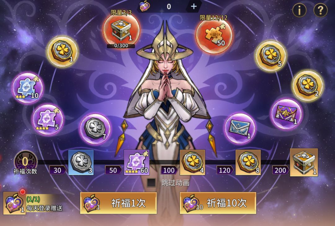 ②祈福达到指定次数可以额外领取奖励,祈福200次必得1个红色3星装备自选箱进度奖励。