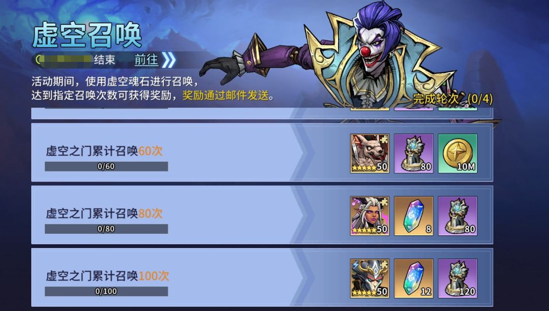活动期间,使用虚空魂石进行召唤,达到指定召唤次数可获得:苏比拉、悟空、辛芭拉雅、星环宝石、联邦之住等奖励,奖励通过邮件发送。