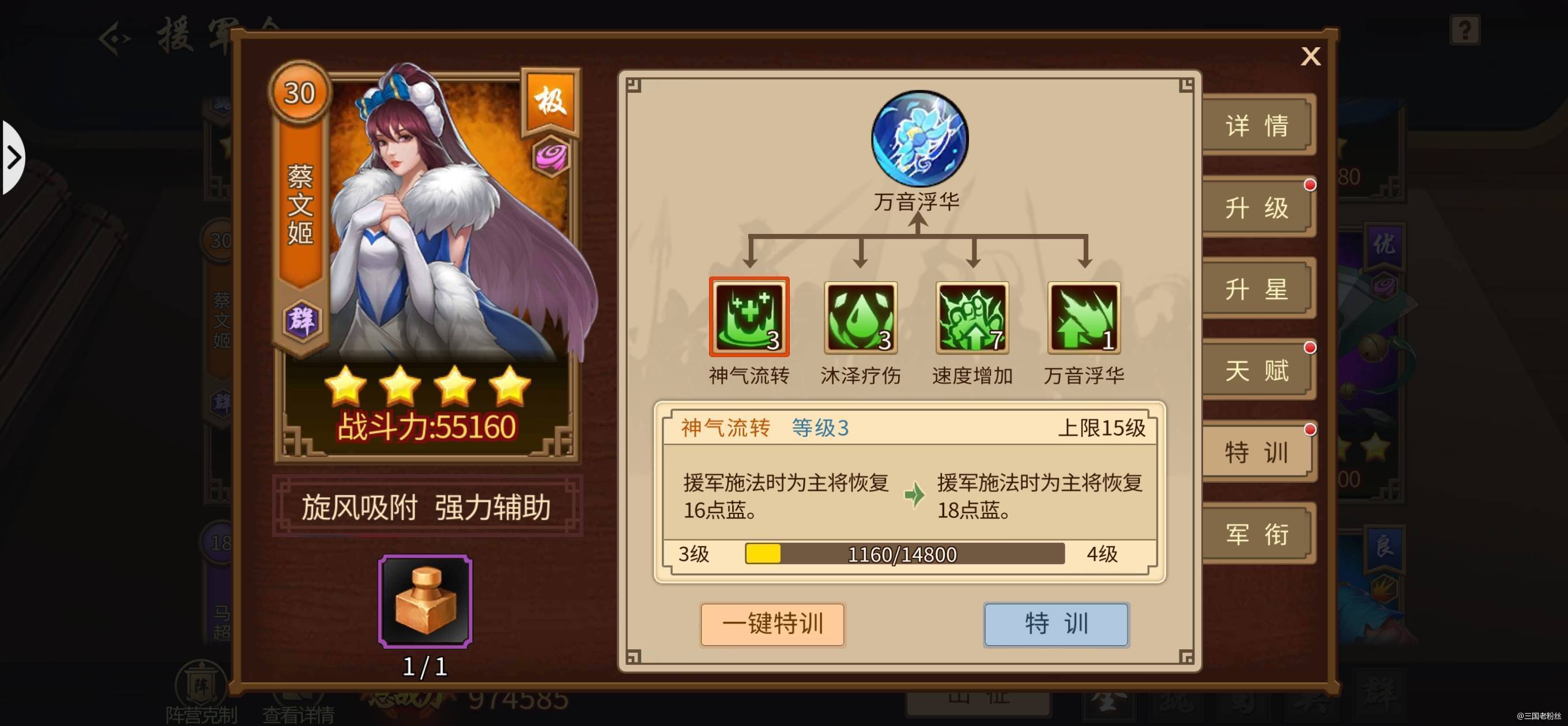 蔡文姬,加蓝,加血,加速度,堪称最佳辅助援军,如果你有个华佗,那么一个主力带华佗,一个主力带蔡文姬,那场景,肯定很安逸。