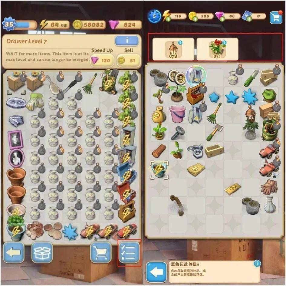 比如在原版的《Merge Mansion》中,展示合成目标工具的任务栏是单独放置的,玩家需要点开才能进行查看和确认;而国服版本则直接将任务栏拆开放在了合成棋盘的上方,玩家在合成的过程中,可以一目了然地看到目标任务及其进度情况,在达成目标后,玩家也可以一键跳转到庄园模块,直接完成对应的修整任务。这一修改大大降低了玩家的切屏频率,提升了游戏的连贯性。