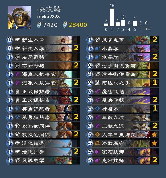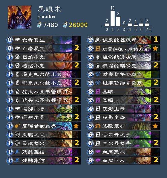 来自 噬月者丶危风满楼 以高胜率打上传说的一套快攻德。快攻德,一套跟海盗战同时诞生于加基森的古老卡组,随着新版本的补强历久弥新。补丁后随着奇迹法的猖獗,快攻德应劫而生,成为counter法师的不二法宝。构筑上采用经典的海盗体系,聒噪怪可以说是这版本最大的补强了,萌物来袭这张小赖皮也是朴实无华,雷霆绽放对于快攻德来说有好有坏,但也让其前期的超展开更为恐怖。而书虫则是被解一波之后,全村人最后的希望。
