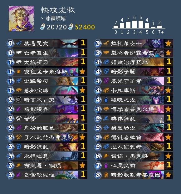 来自丶冰霜领域以高胜率打进国服前二百的一套宇宙龙牧。宇宙龙牧是宇宙牧的一个分支,相对而言宇宙龙牧有更扎实的站场生物,更好的快攻抗性(指破晓之龙),更多样的获胜手段。缺点是斩杀伤害不如纯走A牧来的高,但是这可以用生物蹭血来弥补。新版本给宇宙牧的补强巨大,所以宇宙龙牧也从新卡获得了质的改变。除此之外,宇宙龙牧获得了一张让节奏变得超舒服的卡:龙族研习。这个卡一方面解决了卡没龙的问题,一方面可以让龙的费用降低,3费的破晓之龙哪个快攻不怕?此外,由于博学者的关系,高费龙要重新选择,降低密度,从而保证排序后尽快抽到拉兹和子嗣。所以5费以上的龙只选择了龙人侦测者和碧蓝幼龙,这里选择碧蓝幼龙而不是雏龙巨婴的原因是一方面可以享受法强+1,使得吐息/苦修伤害更高,一方面不会被dk消灭。感知宝珠同样是重要补强。此外还带了脏体系,暗影狂乱在这个环境内或许比疯狂药水更好用,尤其是打术士。带紫软因为奇数贼比海军贼更多。强效治疗药水是面对快攻的一个巨大奶量,因为龙鳞祭司/暗影视界的存在上手很容易。变色龙、拉祖尔、密探来报脏牌三人组,可以带来意想不到的惊喜。