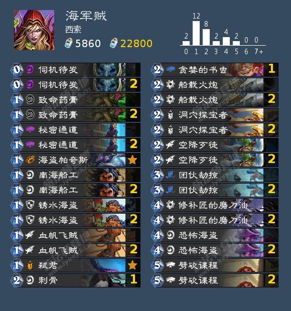 来自斗鱼主播西索的一套海君贼,他本月用这套打出了传说第五的好成绩。秘密通道削弱之后,海君贼的构筑又有了新的调整,这套整体上已经非常成熟,不建议修改。构筑上选择带满过牌,一张血帆飞贼可以补充一费节奏,提供炮弹,两张容易后期卡书虫,外加一张刺骨补充伤害,卡组整体尽可能以流畅为主,十分平滑后续十足。因为通道的削弱,放弃了假币等亏卡的牌。