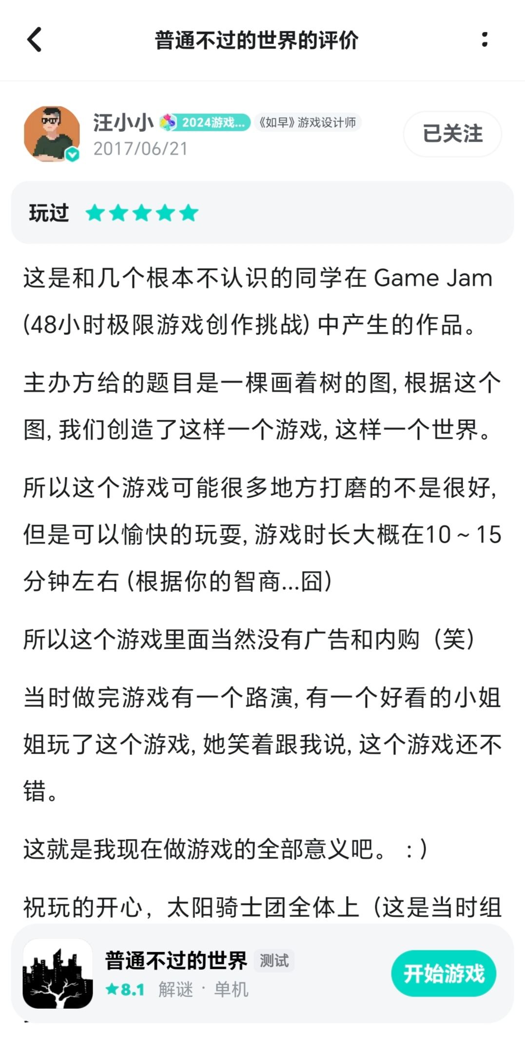 。作为一个未成年小登,看到作者这样年龄的断断续续的故事真的很有感觉的,给我的感觉就完全是一个热血的追梦少年,走南闯北做着自己喜欢的事而且技术力超高的样子。说的奇怪一点就是,搜寻作者大大的人生痕迹也像是有作者游戏这种风格的一款游戏了。四、结语