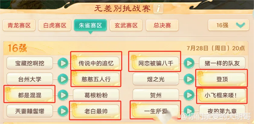 近半个月,大话手游无差别挑战赛持续火热进行中,经历过海选赛和几轮淘汰赛,相信很多玩家朋友和大明一样,已经晋级明年无差别的海选赛了吧!截止今日,各赛区已经决出八强名额,各支队伍离拿到赛事奖金仅一步之遥!
