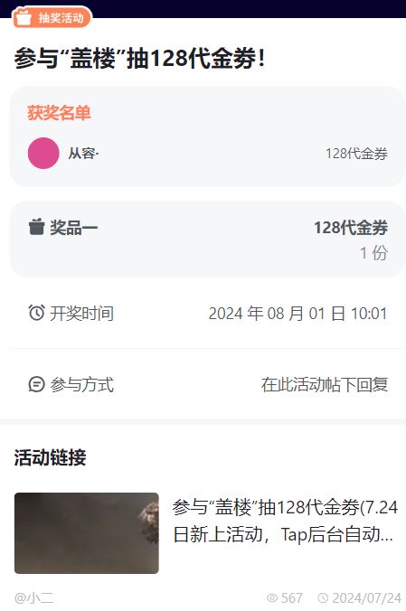 参与“盖楼”抽128代金劵7.24日新上活动(Tap后台已开奖)