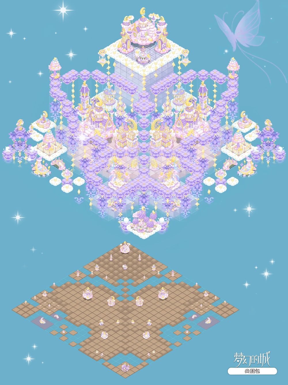 在这座被紫藤花环绕的城市中,四周散发着淡淡的花香,蝴蝶在花间轻盈起舞,每一次振翅似乎在诉说着一个温柔的梦境。夜空下,星光与月光交织成一张温柔的网,云上城海岛的每一寸土地都沐浴在柔和的光辉之中,如同童话中的仙境~