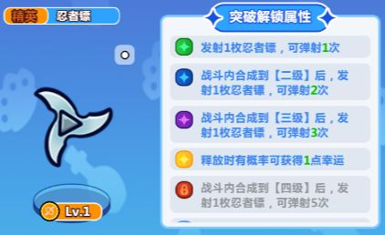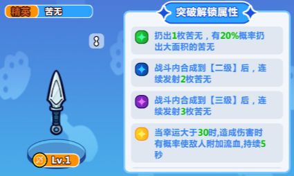 苦无:合成到红色就到可以了。苦无和匕首可以二选一,看个人更喜欢哪个(均占2个格子)。匕首是一级就附带 25%流血,而苦无要到幸运>30 的时候才有概率使敌人流血,相比较而言我更喜欢苦无是因为他有几率会一次性丢出5个苦无,攻击面积相对更大。