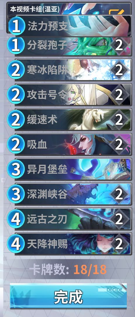 卡组说明 : 上图仅为本视频关卡所配卡组。因为卡组这种东西并不是绝对的,不要看别人怎么配就完全照搬。要根据副本小怪或者boss的特性所配。有很多副本的怪免疫冰冻,或者萌新没有法力预支这种限定卡,就可以把冰冻陷阱等卡换为保温斯顿的圣盾,不灭(石肤术)或者跳费等卡。这个阵容必备的卡只有攻击号令,分裂孢子,远古之刃和跳费卡。