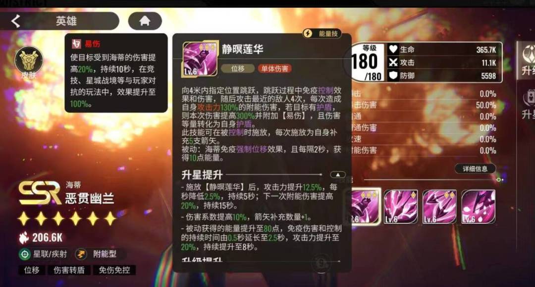 静暝莲华,自身为中心跳跃至4米内指定位置,跳跃过程中可以免疫控制和伤害跳跃结束2.5秒内同样免疫同时提升20%攻击力持续8秒,随后对最近敌方造成4次最大攻击力附能伤害,若目标持有护盾,伤害增加并挂上易伤持续10秒(PVE增伤20%,PVP增伤100%)并转化等量伤害为自身护盾,被动每秒恢复40点能量,经测试10秒左右可以释放一次,每次增加6只箭矢