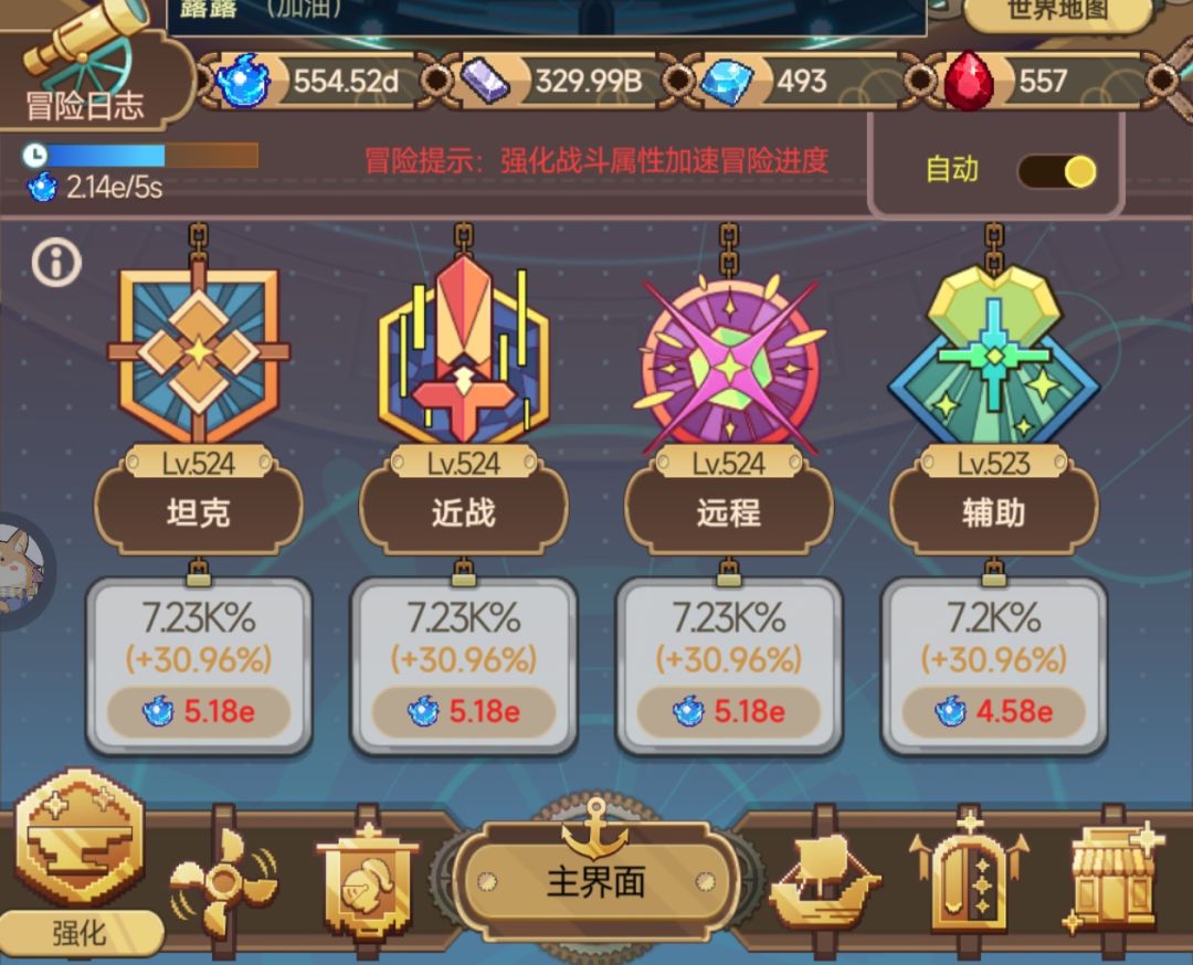 1.飞艇角色强化:这个前期根据任务点就行,材料溢出。后面这种让点到多少的任务就很少了。主要先点攻击和坦度,基本都是点到突破了就点下一个,这样能均衡发挥资源作用。目前第一天资源往后点就比较多了,可以直接开自动也行的。(一定时间内,可使用引擎中自动获得的魔力来增强各职业的属性。强化仅适用于主线关卡!)