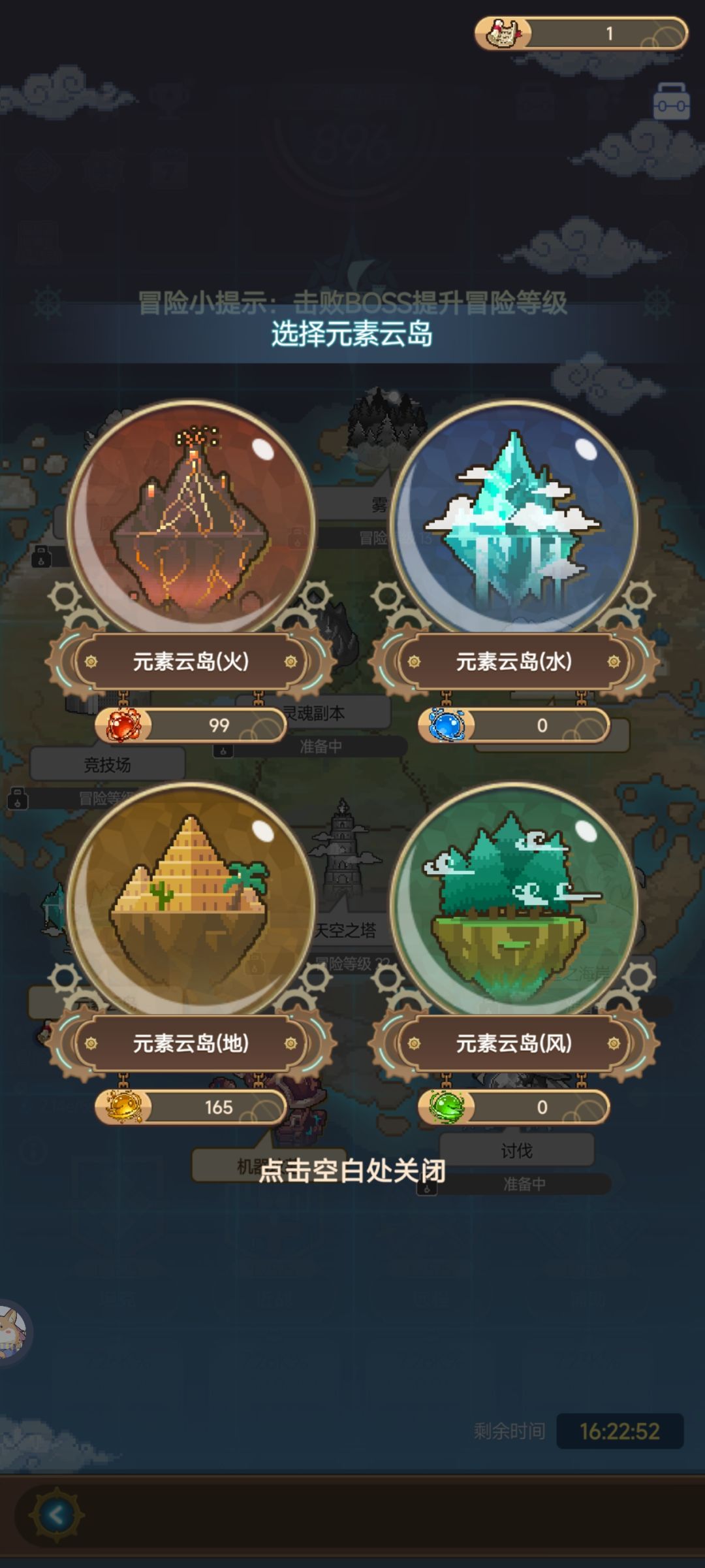 5.元素云岛:这个必须注意,不要均衡的去打各个元素,很亏!!因为主要玩的火队,所以我直接全打的火元素岛,能多不少装备炼金材料,主要给现在的角色装备。前期有啥带啥,刷新10上限。