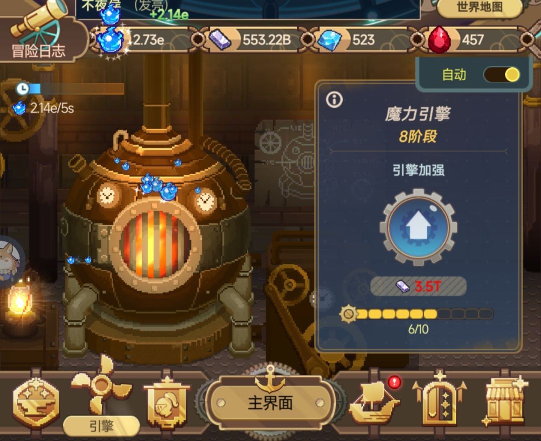 2.引擎强化系统可以通过强化/改造引擎来增加魔力获得量。获得的魔力是提升角色等级的重要资源,前期资源多可以至今升就行,后面就把自动升级开开就行。基本到8阶段就很慢了,因为后面想要突破成功看运气,保底的话会花费3倍资源。