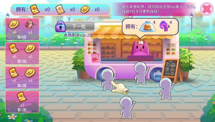 点击小白为他们发放松饼,成功找出vip客人即可召唤下一批客人,努力收集参赛券和金币吧~