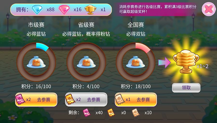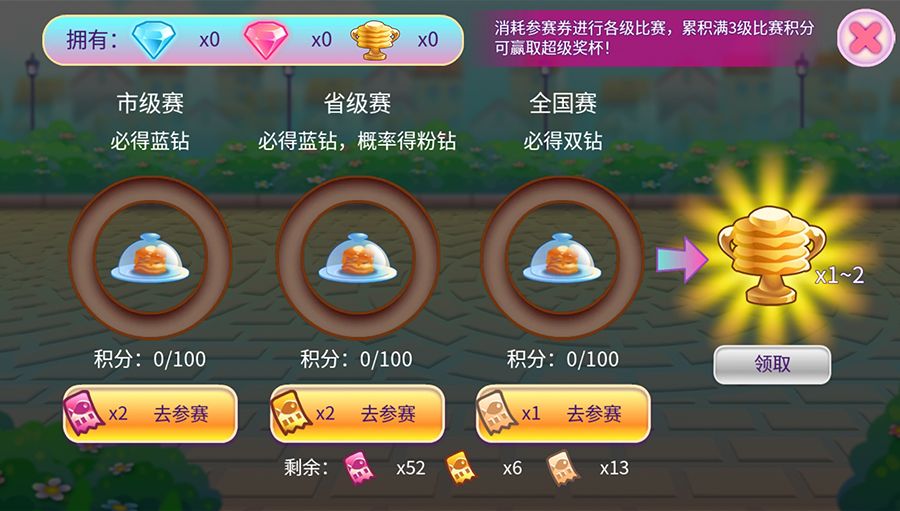 使用对应的市级赛、省级赛、全国赛参赛券进行比赛,获取钻石、奖杯奖励,之后就可以去兑换新鱼啦~