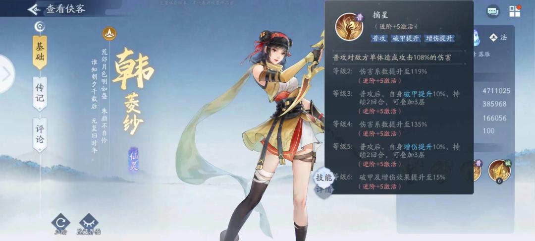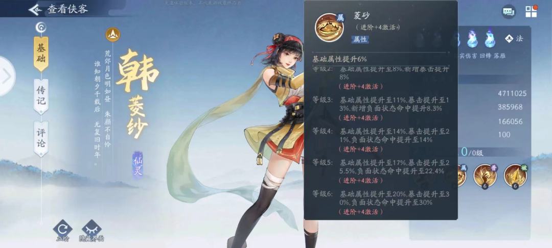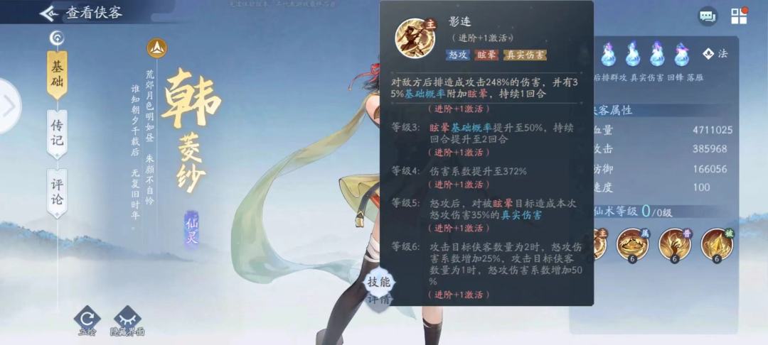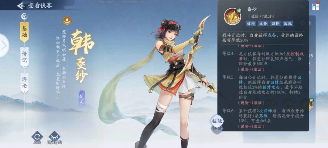 等级3:友方侠客攻击被韩菱纱眩晕目标时,韩菱纱获得回锋,储存友方该次攻击直接伤害总值的30%用以抵挡伤害,抵挡值可叠加,最多不超过自身攻击的350%,持续2回合
