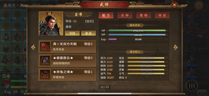 喜欢吕布的天魔皮肤,就想把白门楼过了,但是没司马,没医仙,没兵仙,没马超万人破不了不屈。。然后就开始了痛不欲生的实验。。。三个主力属性如图。。。emm。。。我知道很低。。。。
