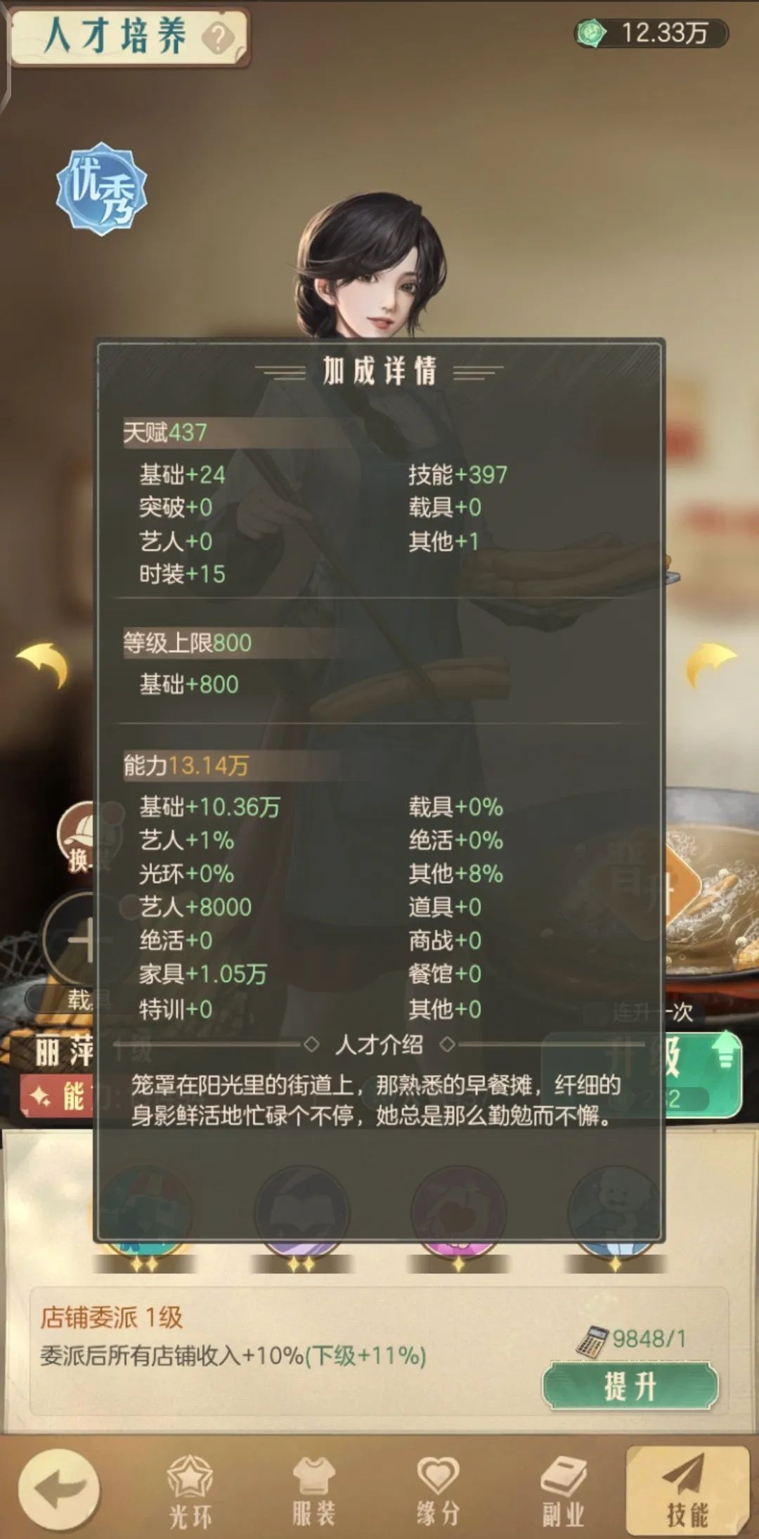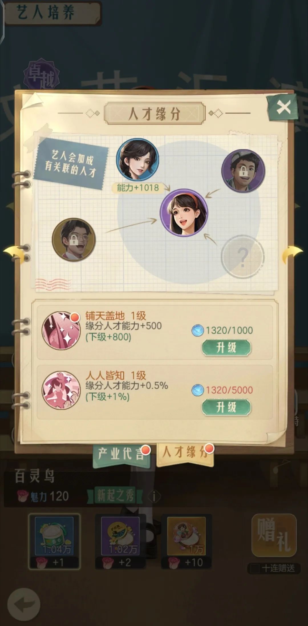 3、在还没获得【艺人-海燕】的时候,其他艺人的魅力值可以稍微平均一点,日常艺人魅力值可以平均150以上,技能提升至15左右就可以;如果已经获得了主培艺人,那推荐将魅力道具全部投在主培艺人身上,因为魅力值提升越高,解锁的技能也会越多。