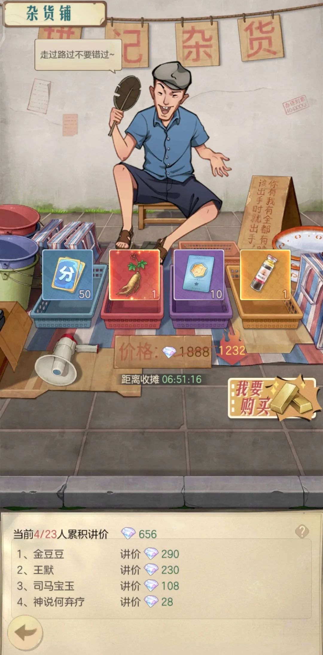 钻石还要用来吃席,可以自己请客吃席,也可以跟其他玩家互相赴宴。饭币每天优先购买旅游车票、阅历卡。