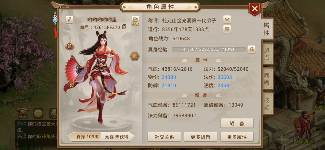 我现在玩的是109法火,因为还没弄首饰,暂时还是差了一点,目前我们队伍的目标是先追道行,一点点增强实力。对我来说,能和队友们在一起玩就是最大的荣誉了,我也相信后续努力什么都会有的。
