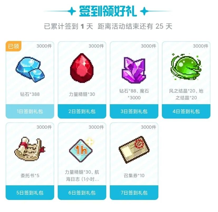 活动详情:完成7日任务即可获得【钻石】、【3星骑士自选箱】 、【力量精髓】、【方块】、【委托书】、【觉醒石】等大量珍贵奖励!