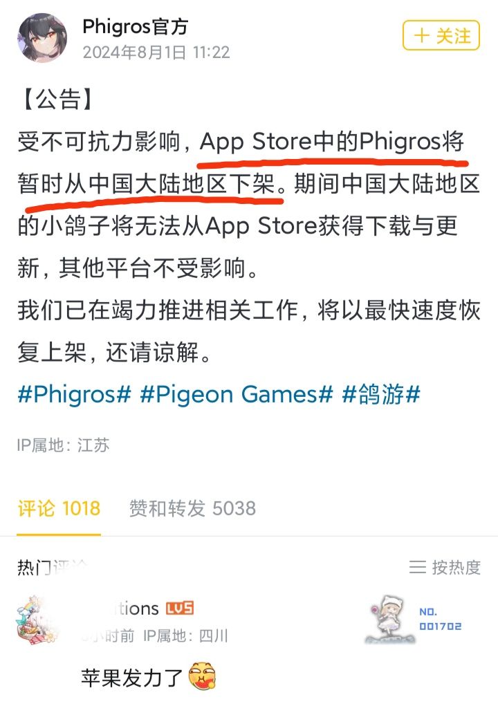 8/1号中午,《Phigros》小破站官方宣布:游戏又被App Store下架了,正在竭力争取恢复❗❗❗