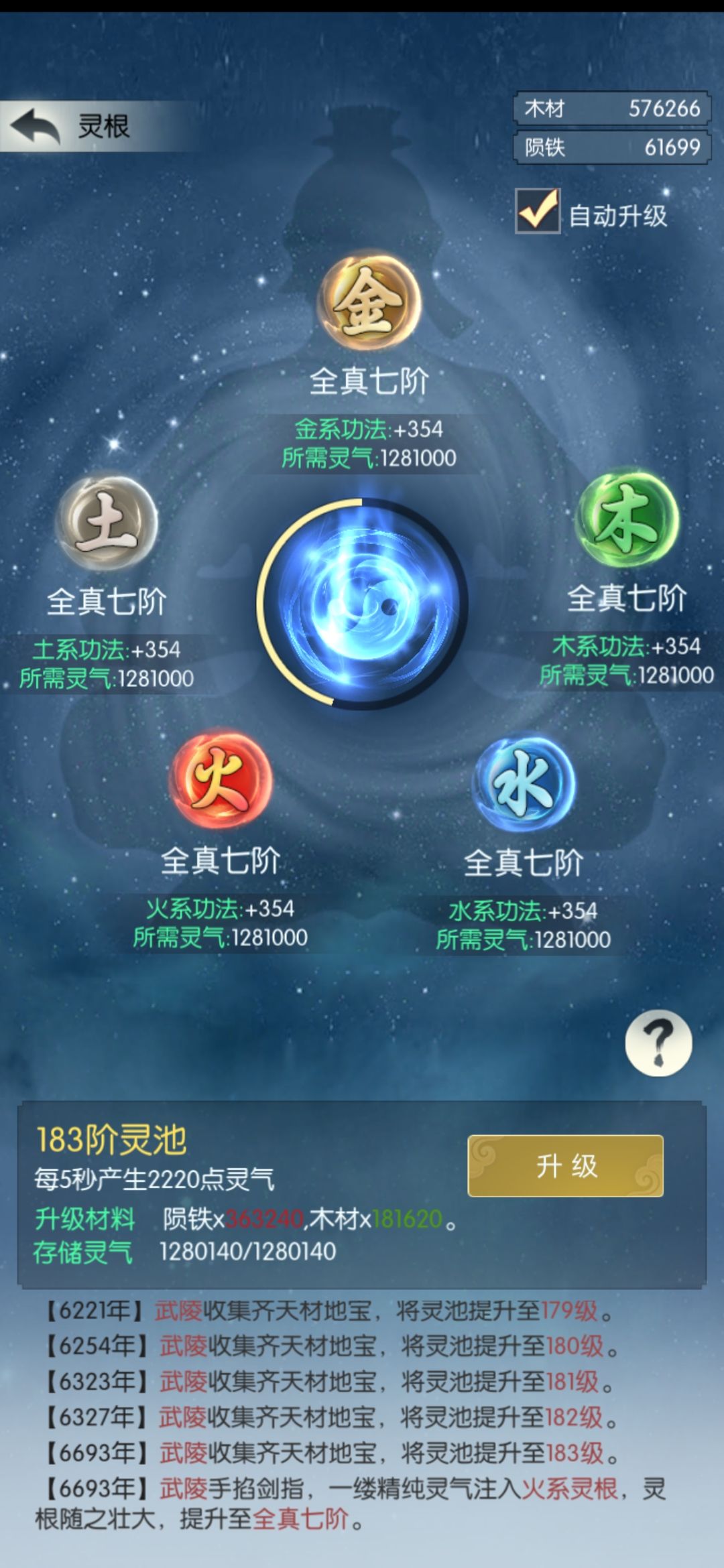 灵池灵根升级,可以增加功法,每种灵根对应一种五行。我们学习的功法书籍,可以提升真气、根骨、体魄、身法、悟性和机缘,功法秘籍也分五行,受对应灵根加成。灵根提供的功法值必须由功法秘籍来实现,没有学习对应五行的功法秘籍,功法值再高也没用。没错,在升级灵根的过程中会加属性,那就是你有学习对应的五行功法秘籍。
