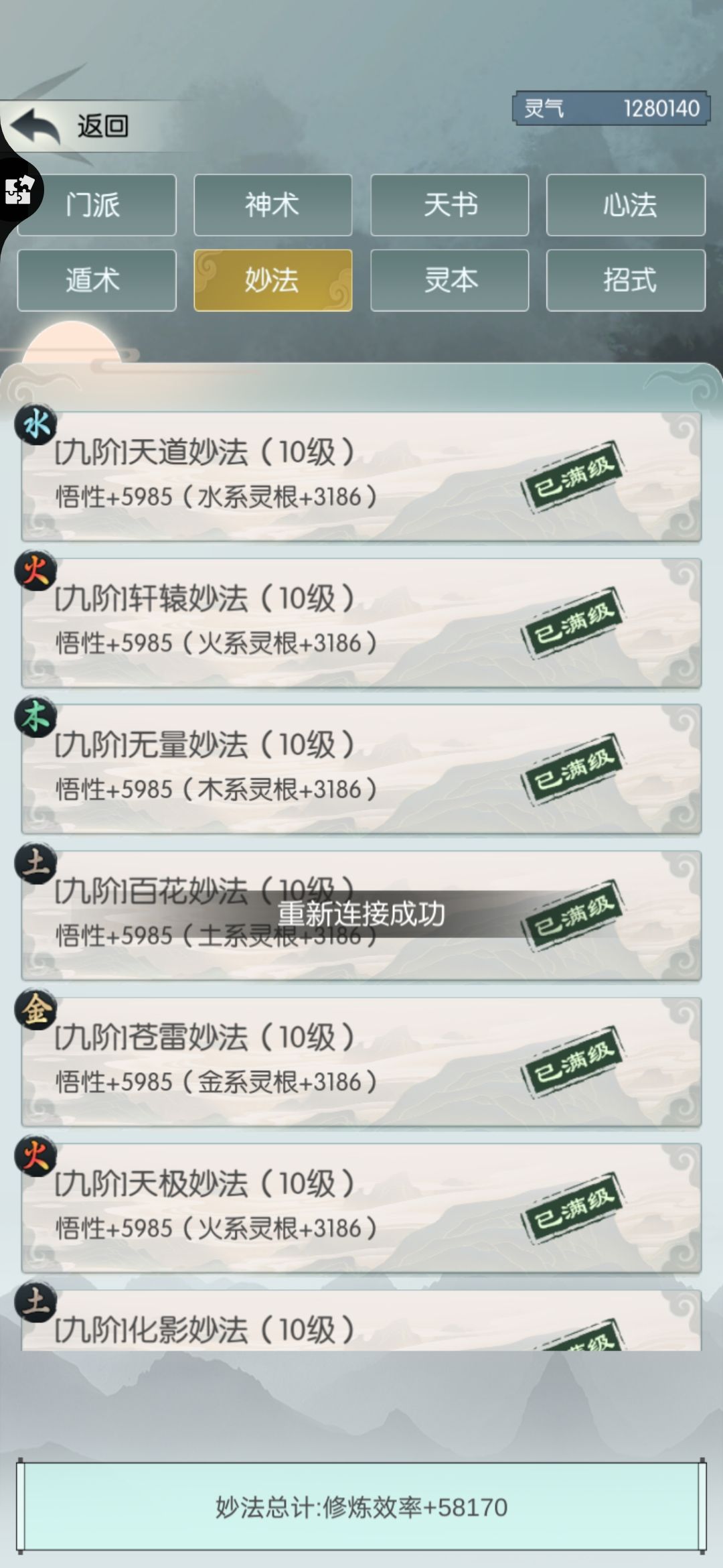 再比如,下图全系灵根功法354,九阶妙法提升悟性5985,其中3186=9*354是灵根提供的加成,功法自身只提升2799