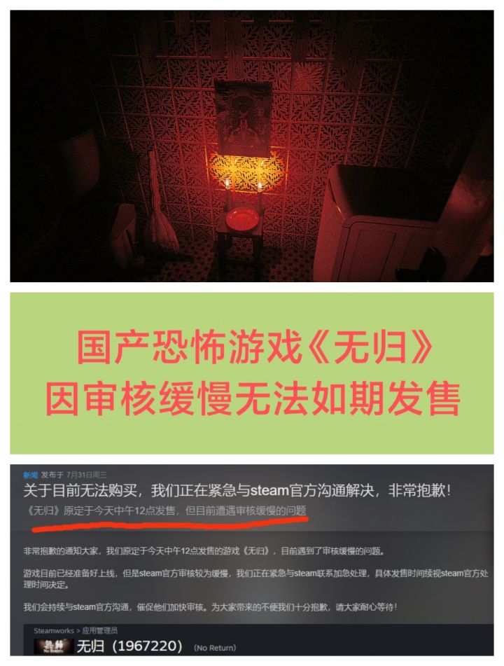 《无归》一款国产恐怖游戏,原定与7月31日中午12点上线steam发售,由于审核缓慢,无法按期推出