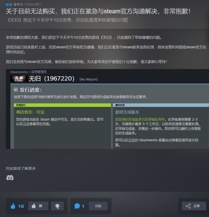 7/31号,《无归》官方在steam平台上发公告,由于审核缓慢无法如期推出❗❗❗