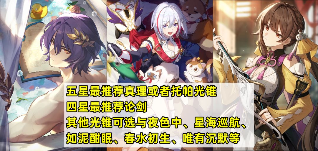 如果按照期望伤害来看,五星最推荐的光锥是真理光锥,其次是托帕光锥;四星最推荐的则是论剑。没有上述光锥的话,还可以选择与夜色中、星海巡航、如泥酣眠、春水初生、唯有沉默等,小三月可选的光锥相当多。