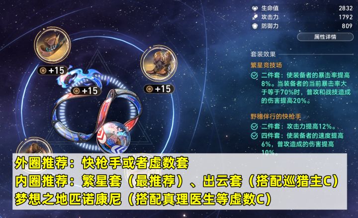外圈推荐快枪手套或者虚数套,个人更推荐快枪手,因为对于不少小伙伴来说应该更好凑出一套词条不错的;过渡可以用2攻击/2虚数/2追击散搭。内圈推荐繁星套(最推荐,注意暴击要上70%)、出云套(主C是巡猎)、梦想之地匹诺康尼(主C是真理医生可以考虑)这几套。