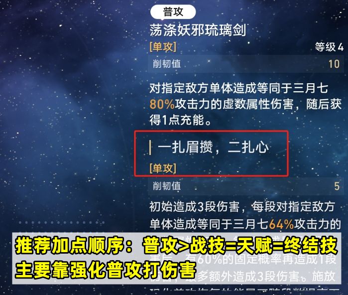 推荐加点顺序:普攻>战技=天赋=终结技,巡猎三月七最主要的伤害来源就是强化普攻;其次战技、天赋和终结技的重要性都差不多,建议有资源都升级一下。小行迹三个额外能力不必多说,攻击力以及四星行迹少见的暴伤加成也推荐尽早点亮。