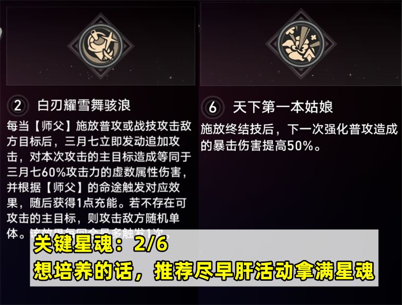 因为活动赠送满星魂,这里主要带大家认识下巡猎三月七的星魂效果。比较关键的是2魂和6魂,2魂给了三月七额外的追击伤害,更重要的是加快了充能。6魂就是简单直接的数值提升,让三月七的强化普攻伤害更高。所以推荐大家,想培养巡猎三月七的话,最好尽早肝活动拿到满星魂哦。