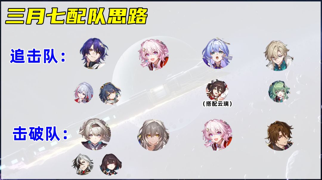 以追击队为例,可以搭配云璃、托帕或者真理医生,配队思路为主C+三月七+知更鸟+砂金/藿藿,如果主C是云璃,知更鸟换成停云也不错。再以击破队为例,可以搭配流萤、波提欧和雪衣等,配队思路为:主C+同谐主+三月七+加拉赫。