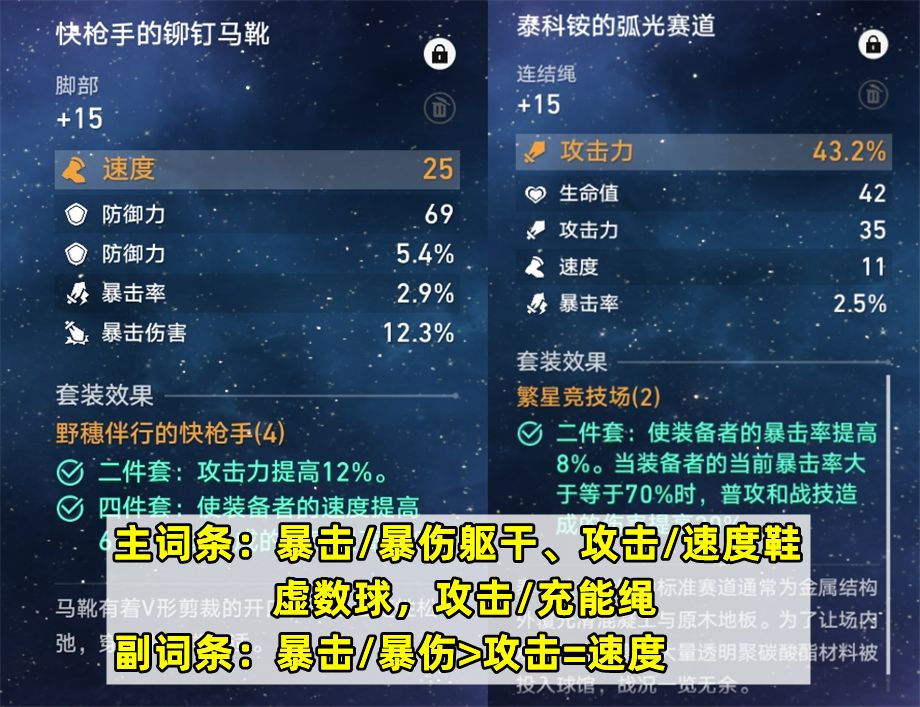 词条方面,主词条推荐:暴击/暴伤躯干,攻击/速度鞋,虚数球,攻击/充能绳;个人更推荐速度鞋+攻击绳的组合。副词条推荐:暴击/暴伤>攻击=速度。