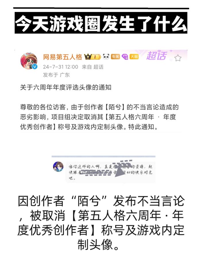 在第五人格六周年年度评选头像活动中,因创作者“陌兮”发布不当言论,造成了非常恶劣的影响,被取消【第五人格六周年 · 年度优秀创作者】称号及游戏内定制头像。