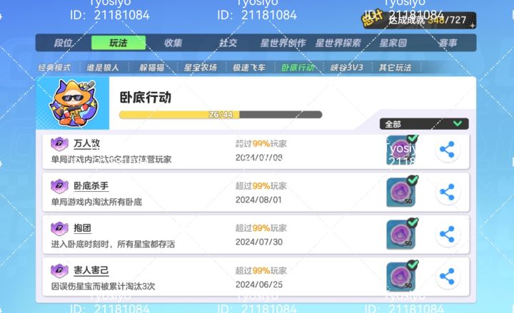 总的来讲,【抱团】可能是最难完成的,运气占很大成分,需要卧底比较菜,星宝跑得快